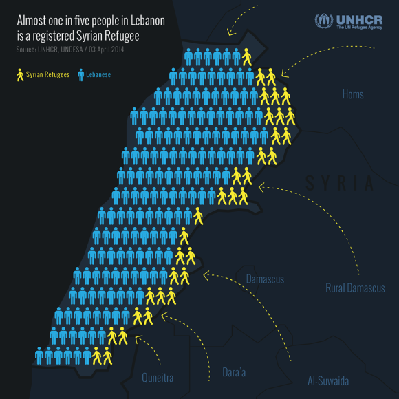 Yesterday, the UN Refugee Agency reported that the number of Syrian refugees in Lebanon had passed the one million mark. A visualization of the news: