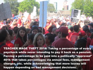 Retired teachers are having their constitutionally and contractually protected payment agreements re-legislated after the legal agreement. Law suits are presently underway across America to stop both forms of wage theft. The main court battles are in Republican dominated New Jersey and Democrat dominated Illinois. To be perfectly clear, it’s not about political issues; it’s about corporate greed and control.