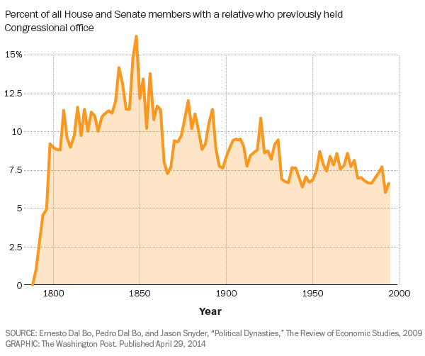 Across all Congresses — House and Senate — from 1789 to 1986, nearly nine percent of legislators came from families that had previously sent a member to Congress. The prevalence of these dynastic legislators has decreased over time. “While 11 percent of legislators were dynastic between 1789 and 1858, only 7 percent were dynastic after 1966,” the authors write. And that number has been mostly flat, according to an October 2013 analysis by Chris Wilson of Time, who found that 6.9 percent of current House and Senate members — 37 in total — come from dynastic families.