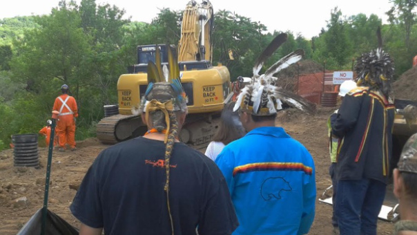 Protesters from Six Nations stopped work at a dig on a portion of the Line 9 pipeline in North Dumfries Thursday morning.